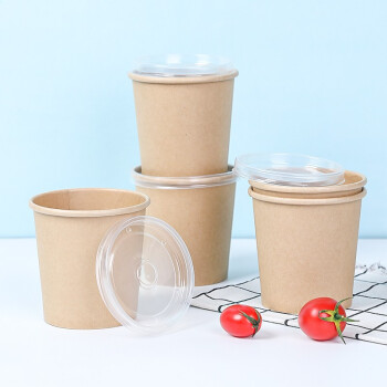 一次性加厚牛皮纸杯带PP盖汤杯 甜品杯咖啡杯12盎司中杯